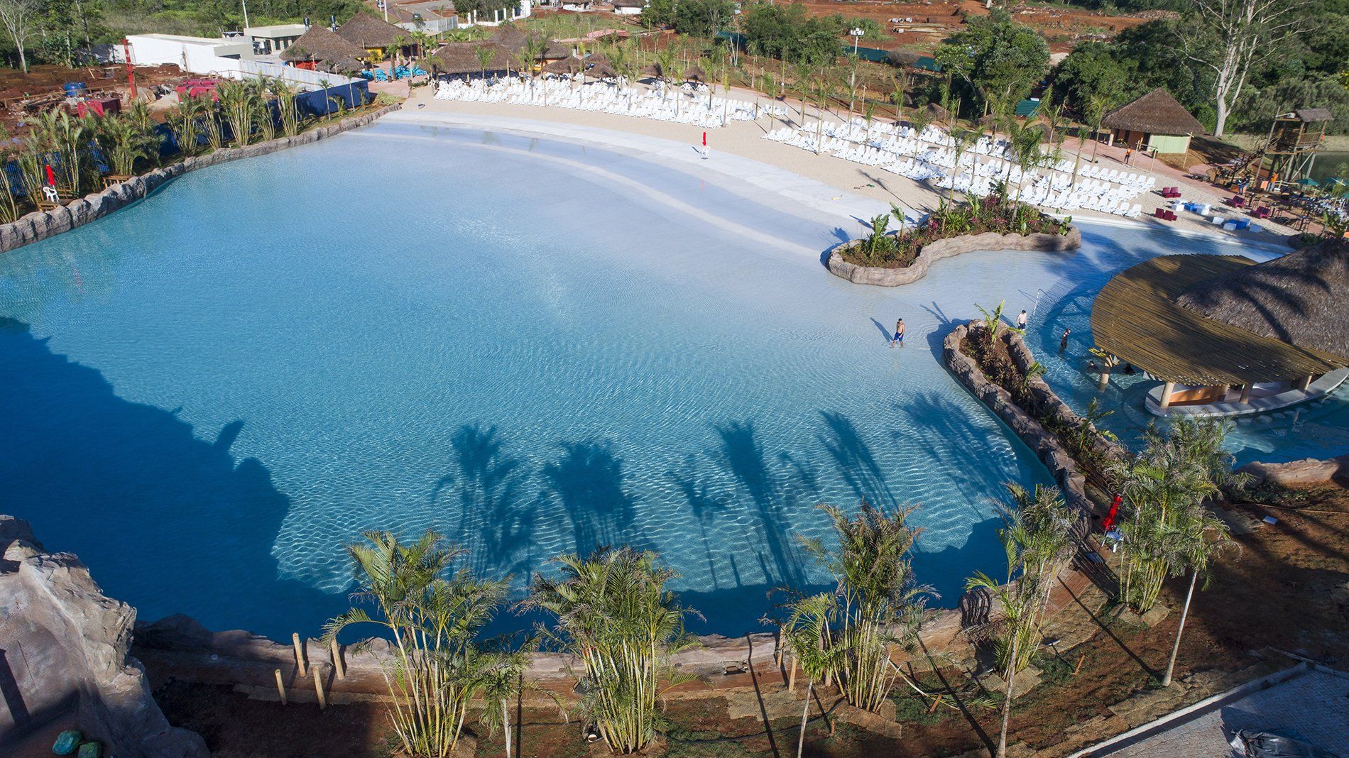 São 9 tipos de ondas que chegam de até 1,20m de altura, com areia de verdade e um cenário paradisíaco onde a cor da água lembra o mar caribenho.